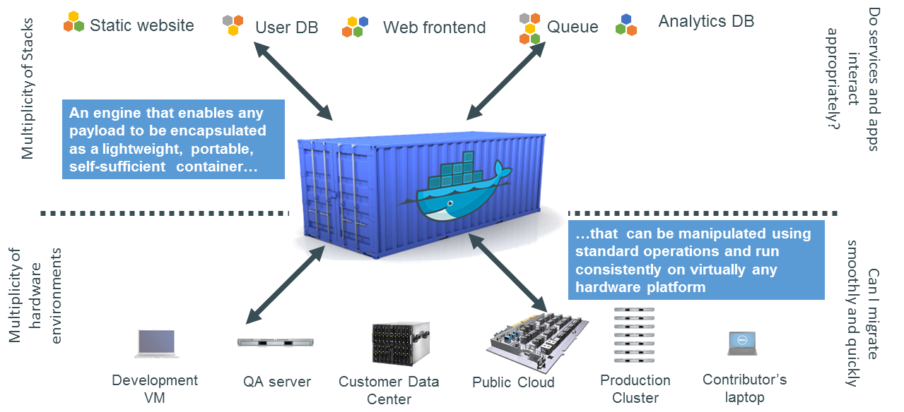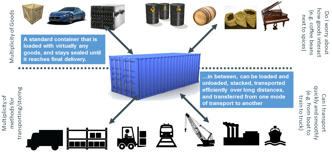 # From Virtualisation to Containerisation  ### Outline * **Presentation** (45m) * **Self-paced Workshop** (2h15) * BE Cloud & Docker (23/11) * To be continued with Orchestration & Deployment (08/01) #### This class will be successful if you understand * why we need a tool like docker * the basics of docker (containers, images) * the basics of a container registry * how to pull an image and run a container * what a Dockerfile looks like ### The need for Containers in software  #### IT Multimodality  #### The Matrix From Hell  #### Analogy  #### Solution ?  #### Solution !    ### Docker  Docker is **a** solution that **standardizes** packaging and execution of software in isolated environments (**containers**) that share resources and can communicate between themselves > Build, Share, and Run Any App, Anywhere [Docker](https://www.docker.com/) * Created in 2013 * Open Source * Not a new idea but set a new standard * Docker is a company built around its main product (Docker Engine) * in charge of dev of everything docker + additional paid services (Docker hub...) Docker is not the only solution for containers